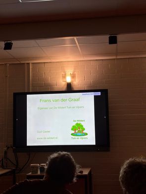 Om 12.00 uur vertrokken we met de bus naar de volgende tuin in Wierden waar we werden opgewacht door de eigenaren Jan en Ina van de De Haarboershof. Deze particuliere tuin was erg verassend van opzet. Er is in deze tuin veel gebruik gemaakt van Bentheimer zandsteen die knusse hoekjes met hoogteverschillen en waterstroompjes vormden en ruim omzoomd werden door bijzondere vaste planten in mooie composities. Jan en Ina zijn ook liefhebbers van bijzondere vogels en bijen. Dit was duidelijk te zien aan de verschillende volières die in de tuin stonden opgesteld en stijlvol zijn opgenomen in de verschillende borders. Ina is hobby imker en verantwoordelijk voor het onderhoud van de bijzondere bijenkasten die in de tuin zijn geplaatst. Ook de inwendige mens werd niet vergeten met koffie, thee en heerlijke taart. Uiteraard door de eigenaren zelf gemaakt. Na het nuttigen van de zelf meegenomen lunch was er nog volop tijd om wat bijzonder plantensoorten te scoren voor de eigen tuin. Daar werd dan ook volop gebruik van gemaakt. Met tassen vol mooie planten en stekken namen we afscheid van de Haarboershof en vertrokken we rond 15.00 uur.
